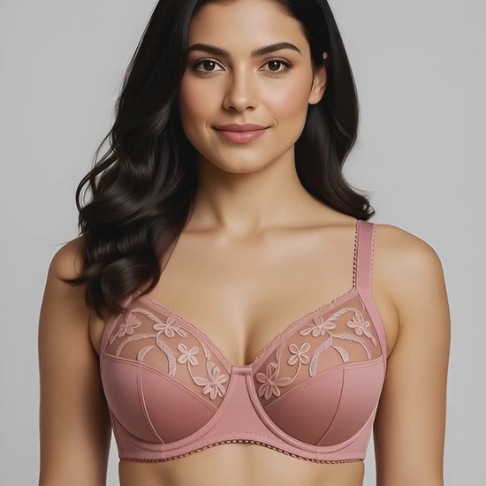 Beige Embroidered Underwire Bra - Floral Lace Full Coverage Support Bra